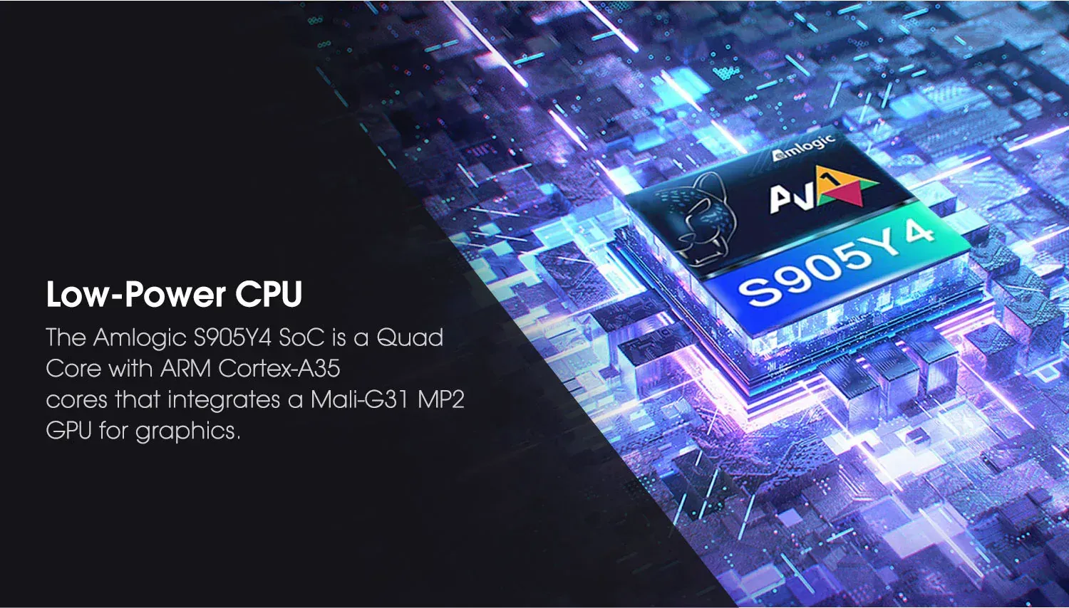 MECOOL KM7 SE con chipset Amlogic S905Y4 con CPU ARM® Cortex A35 de cuatro núcleos de 64 bits y procesador GPU ARM G31 MP2, compatible con 2,4 y 5 GHz, así como una LAN Ethernet 10/100 para garantizar la estabilidad y señal de red fuerte conectada. Admite la decodificación AV1 y se ejecuta con el si...